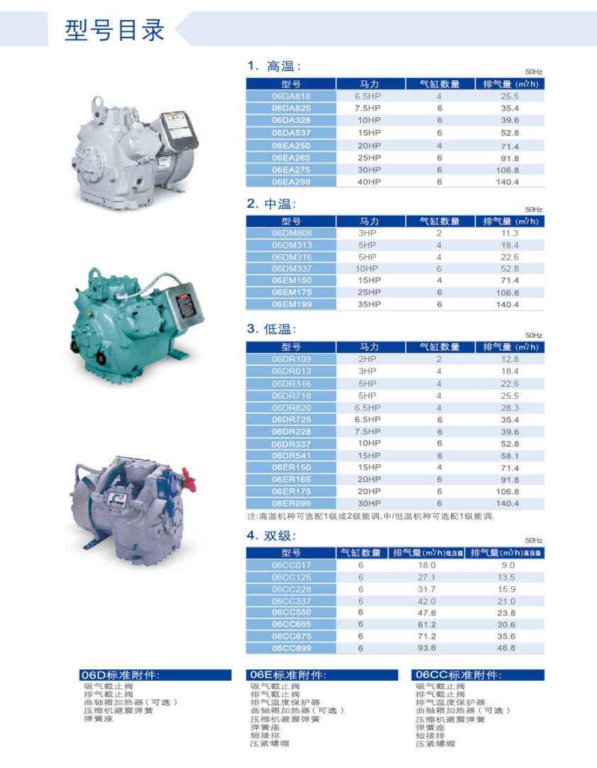 06CC双级压缩机适用于低温制冷工况,蒸发温度范围-20℃至-50℃。