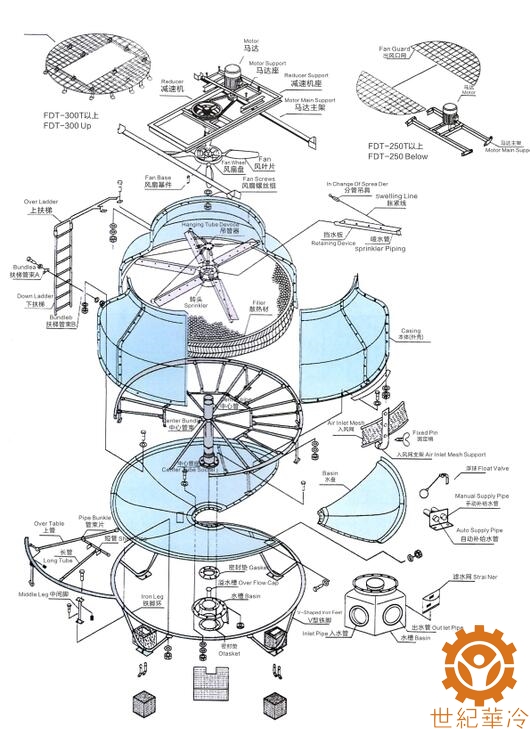风机:由清华大学工程力学系根据系列冷却塔参数设计的低噪声、高效率风机,铝合金板翼型或玻璃钢叶片、噪声小、效率高。
